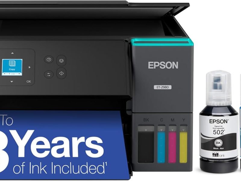 Epson EcoTank ET-2980 Wireless All-in-One Color Supertank Printer with up to 3 Years of Ink, Refillable Tanks, Perfect for Home, 15 PPM, 1.44″ Color Screen, Auto 2-Sided Printing