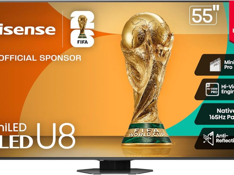 Hisense 55″ Class U8 Mini-LED ULED 4K UHD Google Smart TV (55U8QG, 2025 Model) – QLED, Native 165Hz, VRR 288, Up to LD5600, 5000 Nits, HDR10+, Dolby Vision IQ · Atmos, IMAX Enhanced, 4.1.2 Ch Audio